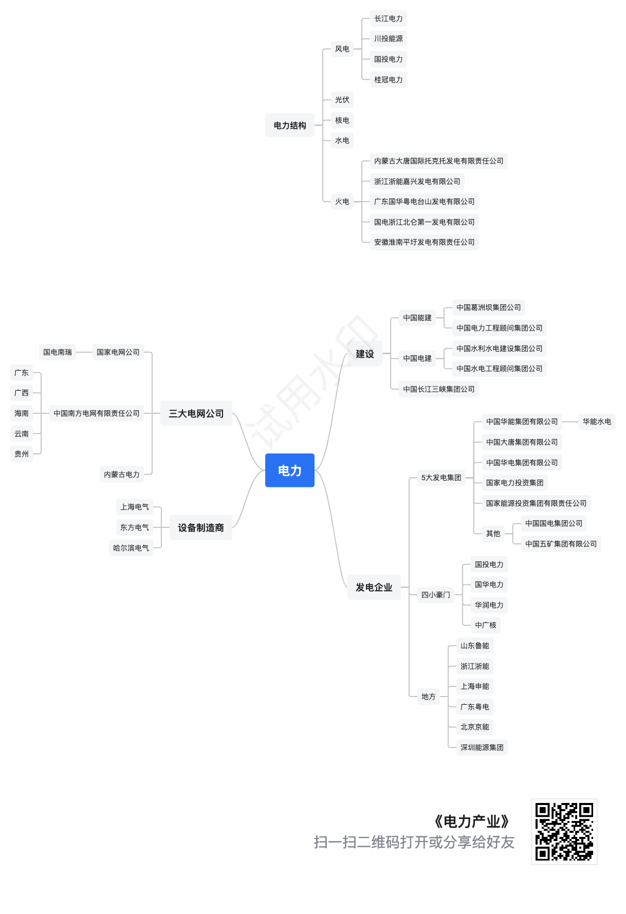- 发电:火电、水电、核电、风电、光伏等;主体为五大发电集团、四小豪门及地方能源企业。